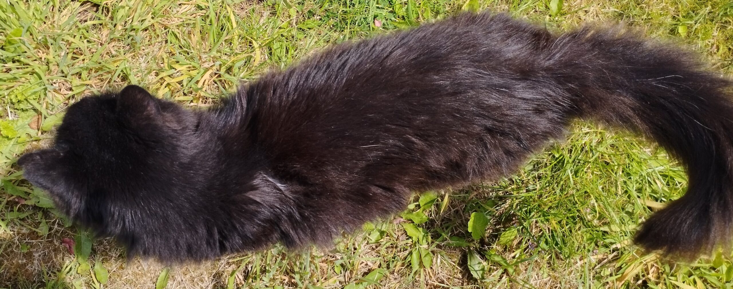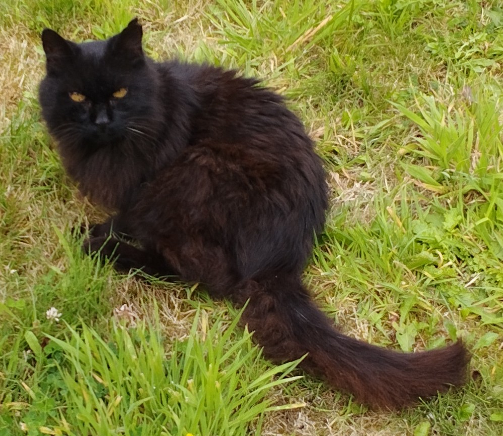 Oberon is helemaal zwart, heeft lang haar met soms donkerbruine ondertoon, en een vrij dikke pluimstaart.